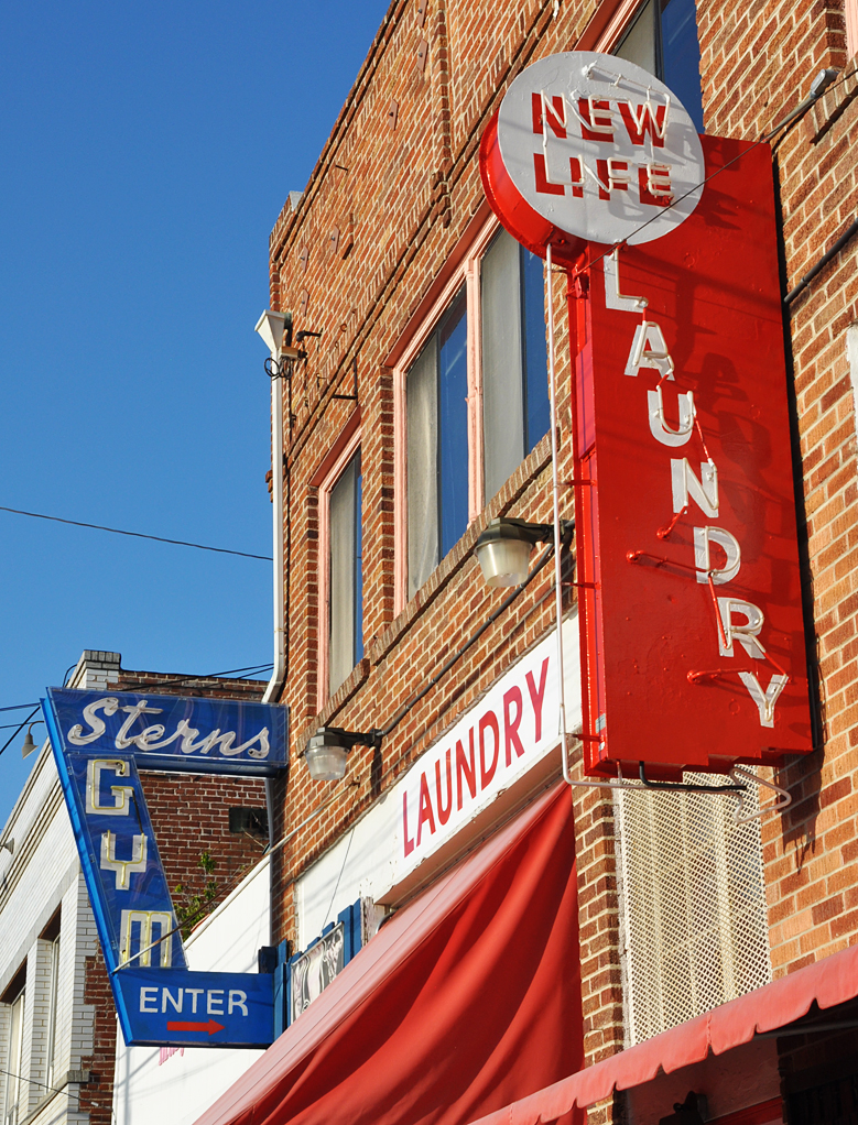 Two neon signs keeping each other company. The Stern Gym sign is protected by clear plastic panels — but the sign wasn’t lit when I was there: