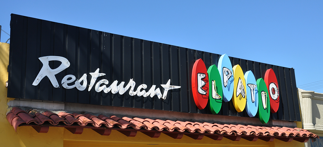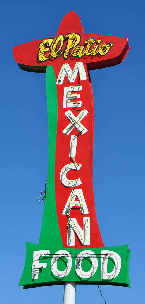 The El Patio gives us a pole sign and a facade sign — but I don’t know if either are still lit at night: