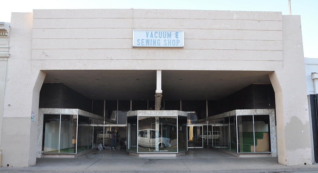 A very sad downtown — it just have been swinging at some point. Here are some nice window display cases: