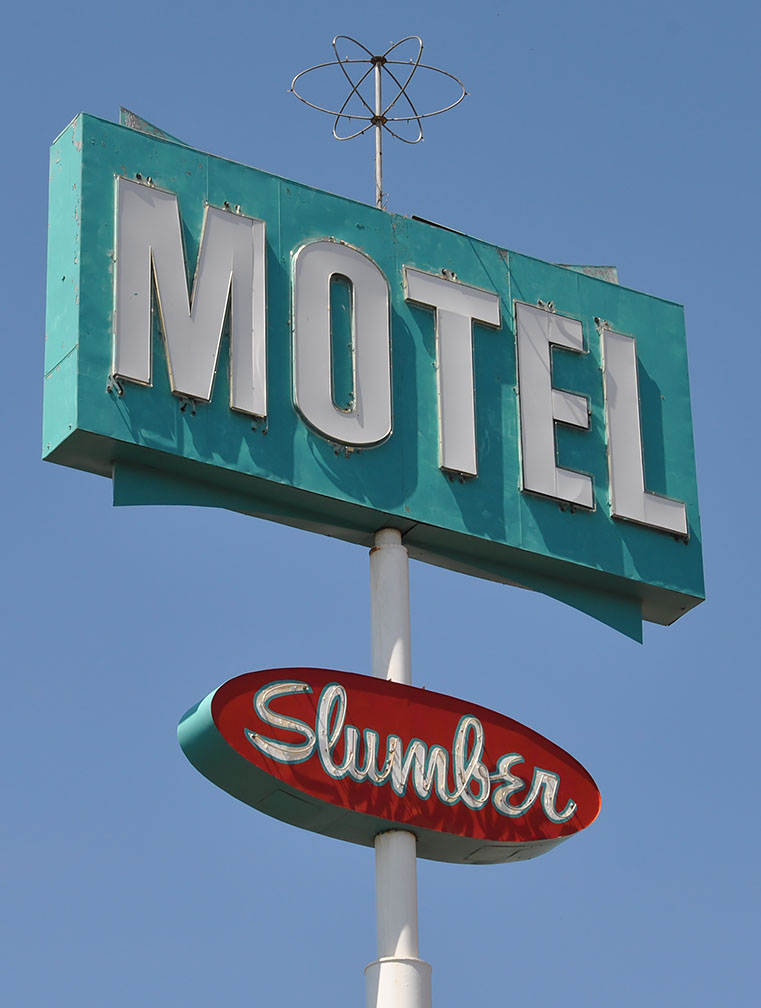 You may recall the Slumber Motel sign from Saturday night’s post. Here’s the dayshot showing the atomic sign topper. It was probably outlined with neon and flashed sequentially: