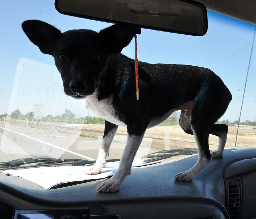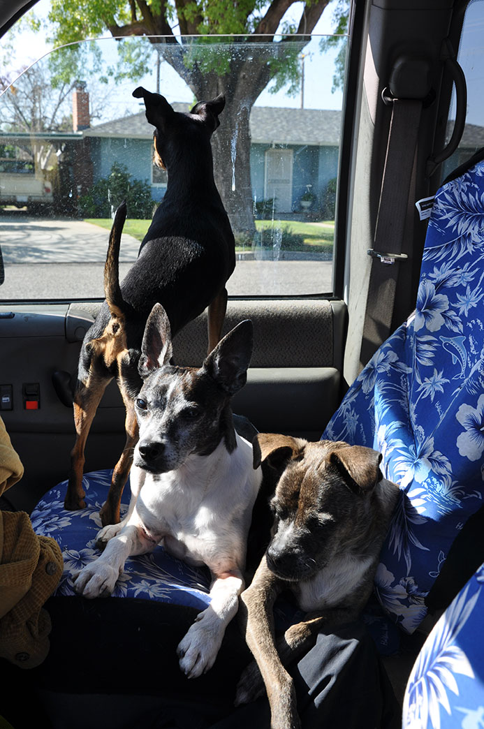 Time for a little tribute to my traveling buds. For you newcomers, my four dogs are present for each and every one of my roadtrips. They are much calmer on Day #2. Except for Gremlin (at the window) who’s always looking for something worthy of ear-piercing barking. That’s Nik (Sputnik) and Fix in the foreground: