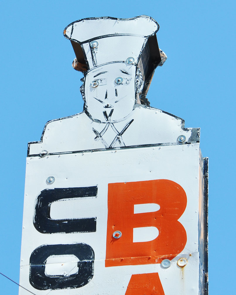The top of the Cornaggia’s Bakery sign in Chowchilla. From the plugged holes and amateurish paint job, this sign might have been really nice in the past. Still cute enough now though: