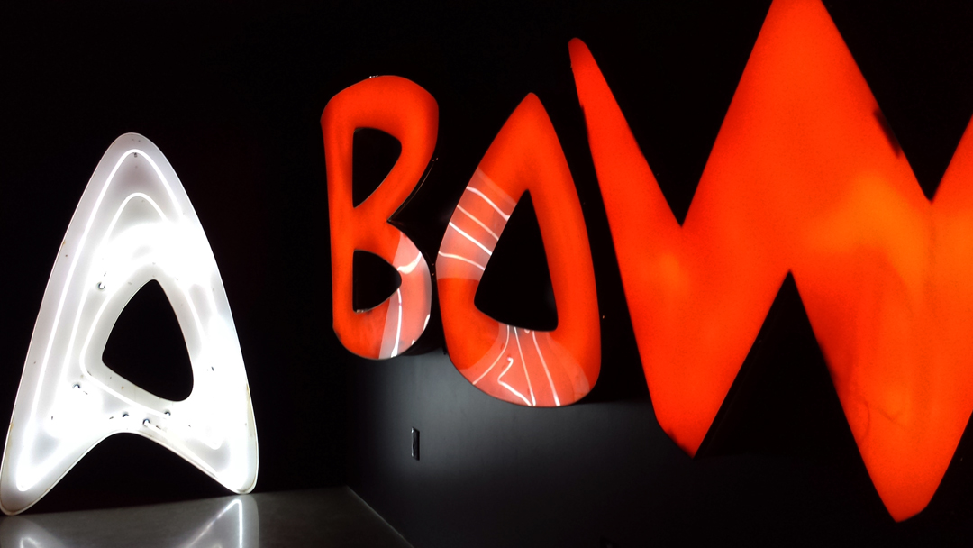 Just a quick “hi” to let you know about a neat little gallery thingie in Los Angeles for all you fans of bowling buildings & signs. The opening was tonight and I toughed out the crazy rush hour weekend-getaway traffic to get my butt down there. I didn’t have my “real” camera with me — but I took a few photos with my phone. I lost my iPhone a couple of weeks ago and I don’t know how to use this new hotshot Samsung phone. But I did what I could — after a glass of wine which lowered my techie capabilities even further.