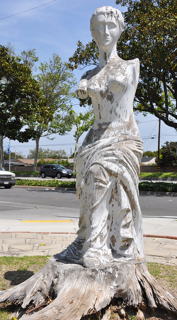 Front yard adornment in Lakewood. I don’t know the story — but it appears to be carved from the former tree. Apparently, meant to be Venus de Milo — but kind of an alien-like face: