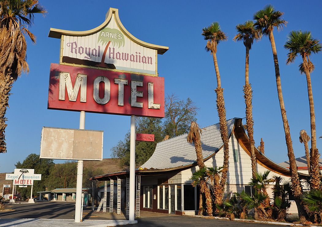 I’ve been debating about whether to blog or not to blog during trips. But for tonight anyway, I have the stamina. So, let’s have at it and start the photo marathon in Baker with this photo from Baker, CA. The building on the right has a Stuckey’s-like roof — matched in the sign itself. Closed since forever: