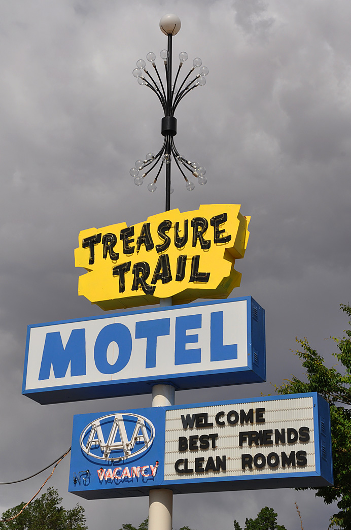 There are lots of sign “treasures” in Kanab — including this one with the neat light bulb thing. Scary clouds in the distance but they didn’t come our way: