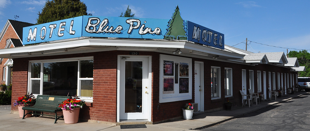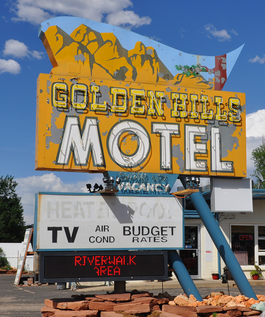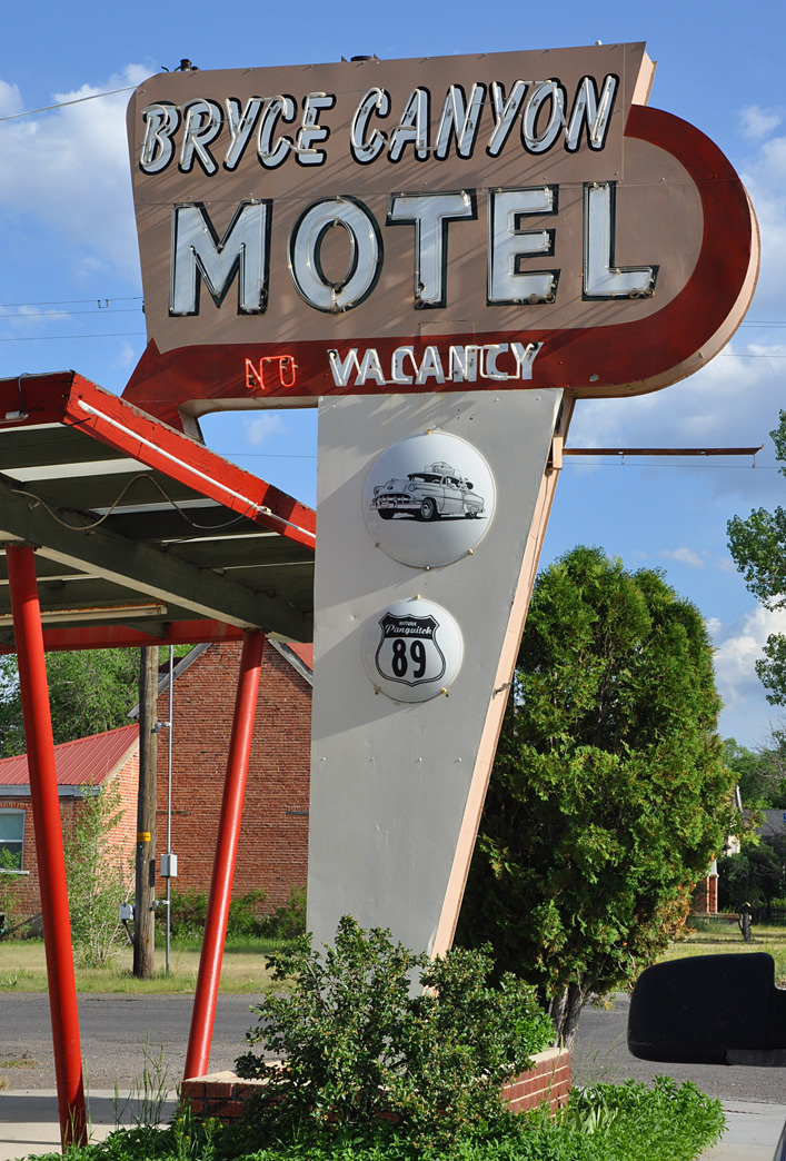 Two unusual scaffold type signs from the Purple Sage Motel in Panguitch. The main sign (not shown) was a boring plastic sign — so maybe it’s not even the original name. Here’s a nice sign on the office roof: