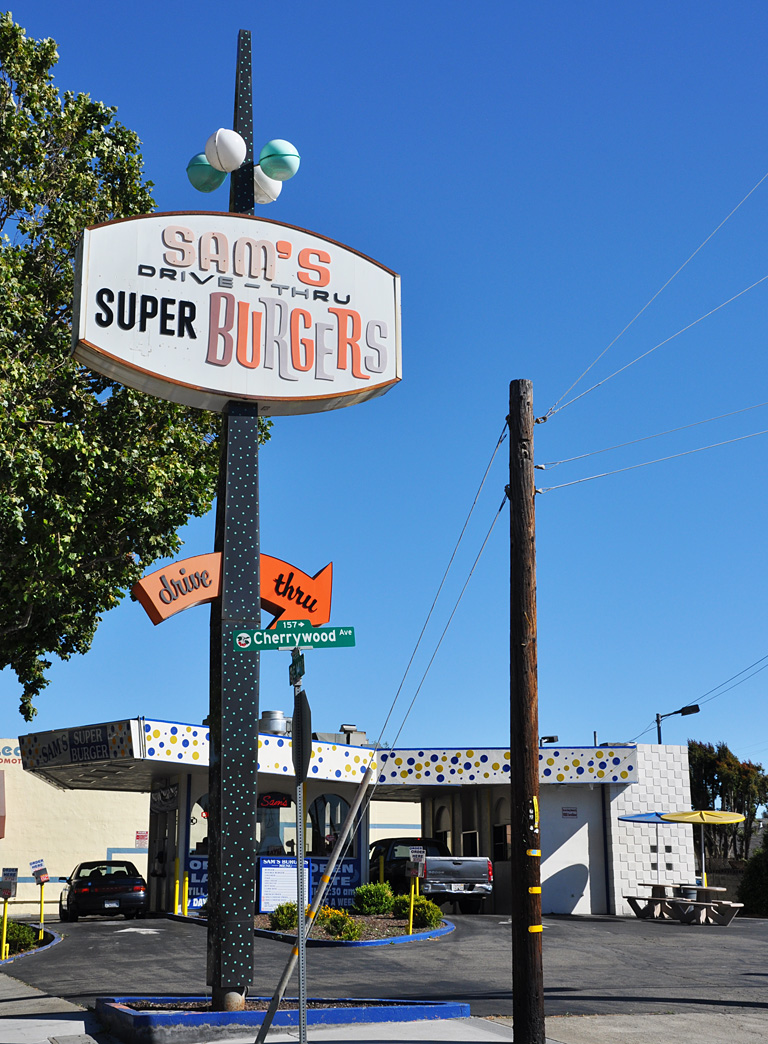 This shopping center sign in San Leandro was restored last year and I was all excited to see it in person. But really, shouldn’t restoration also involve cutting back trees or removing them? I’m all for trees but what idiot thought these belonged less than a foot away from this sign? I’m assuming the sign was here first: