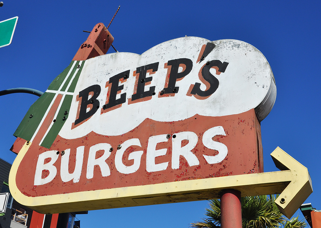 The Beep’s Burgers sign was a lot nicer when it had neon. But at least the rocket is still present. Scroll down towards the bottom of this page for a 2002 photo: