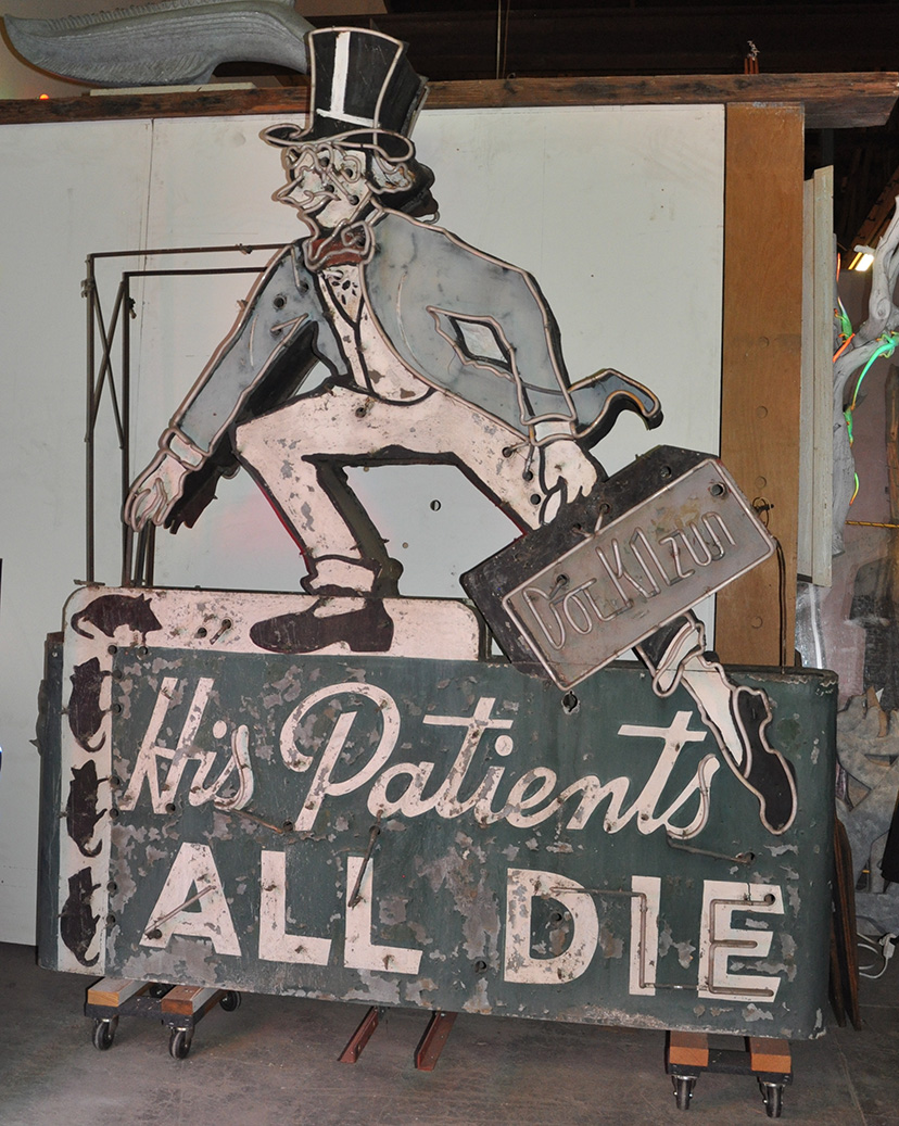 A real “killer” of a sign. This one came from Paramount Pest Control in Los Angeles. The Doc Kilzum character was trademarked in 1938. This sign is from the 1940s. The museum will be restoring this sign as well. “Doc” originally had striped pants and the mice were sequentially animated. The painted over, missing mouse near Doc’s right shoe was lying on his back. Paramount Pest Control still exists and uses this character: