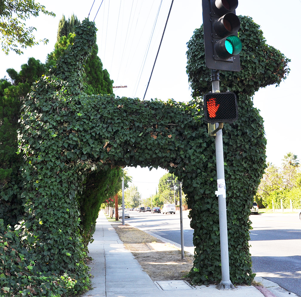 Wrong time of day to shoot this and that stoplight is annoying — but here it is. A topiary Poodle in North Hills. It’s been there for at least 20 years: