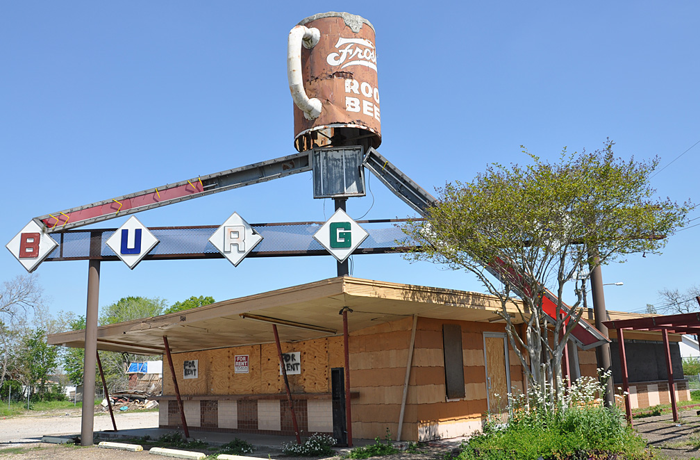 A bit of bad Frostop news. The stand in the Algiers neighborhood in New Orleans, which had been boarded up for many years, was demolished in 2013. A big empty lot there now at Google Street View. Here’s my photo from 2010: