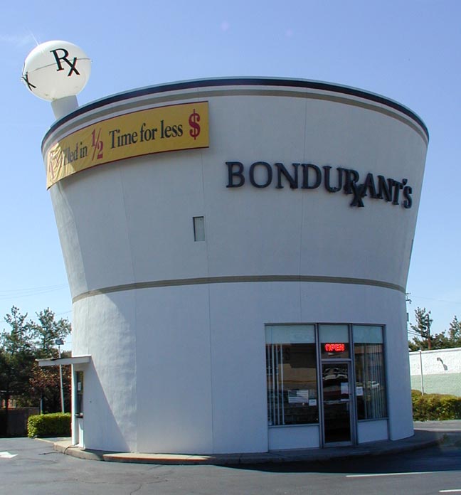 The Bondurant’s Pharmacy building in Lexington, KY was constructed in 1975 . It’s one of those rare mimetic buildings — built in the shape of a mortar & pestle. The store closed in 2011 and roadside folks like us worried about what would happen. Then, in 2012, Imperial Liquor moved in. It’s a wonder that the building survived (maybe it’s landmarked in some way?) but I gotta say the new paint job is kinda shocking. Here’s a photo I took in 2001: