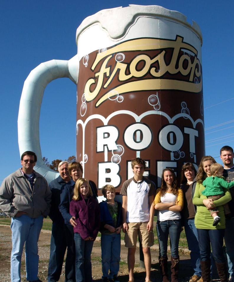 I have three bits of news concerning Frostop Root Beer stands. Around 2011, the stand in Greenville, MS relocated. I tracked down the new address and not seeing the giant mug pole sign at Google, I feared the worst (that it was at a landfill someplace). Here’s my photo from 2007: