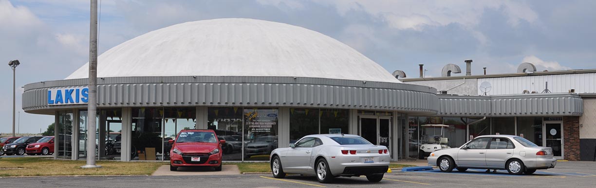 From Galesburg, IL. When I noticed that the name Lakis Ford Dodge had changed to Yemm Ford, I thought it best to make a call to find out if this “Dodge Dome” was still there. The name change took place last year. The woman on the phone told me that the building was being demolished right then! Crap. Here’s a couple of photos from my website to show you what you missed: