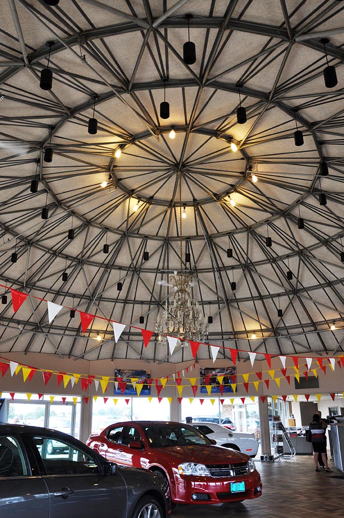 Steve Lakis Dodge was built in 1973 for . These “Dodge Domes” were built elsewhere. I’ve never figured out how many. But the only other one that I know of — and now apparently the only survivor — is the one in Marietta, GA. It was still painted the company colors (white with red trim) when I took this photo of the vacant Marietta Dodge Jeep showroom in 2009: