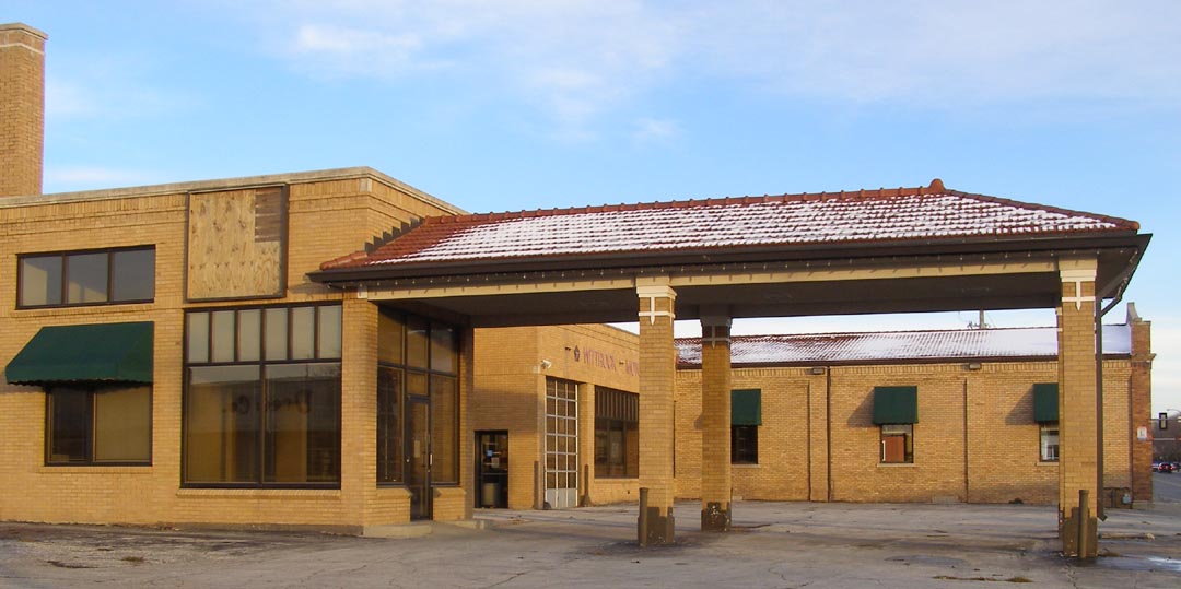 This building in Chicago wasn’t so lucky. This Perillo Lincoln Mercury Saab location started life as a Pontiac dealership. Looks to be late 1940s to me. I took this photo in 2005. There was a service bay or two on the right. Love those big windows to show off the cars: