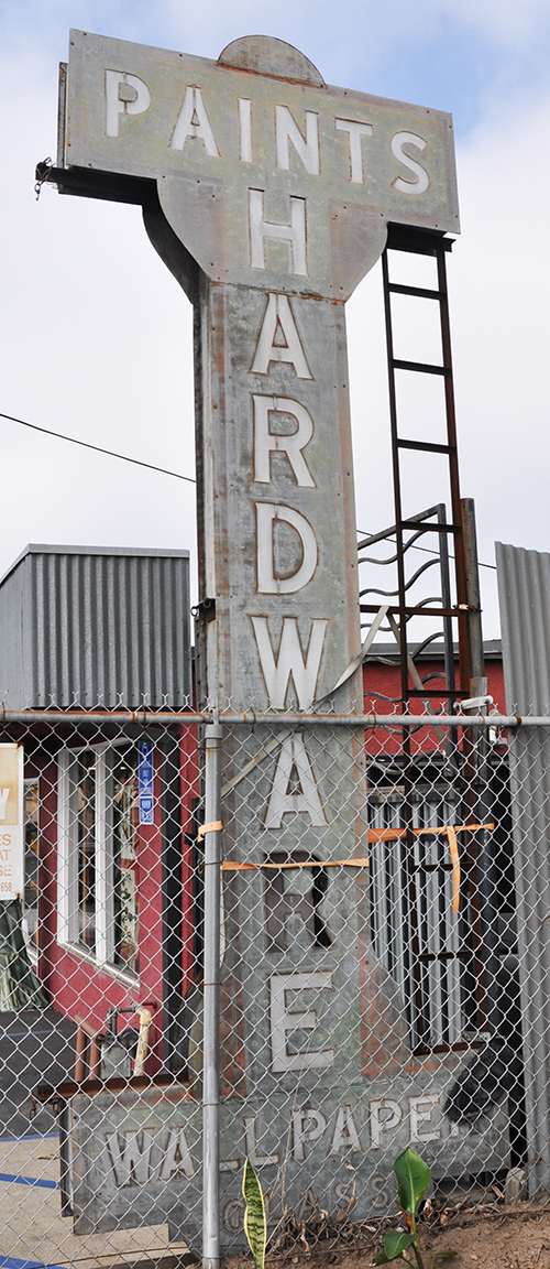 Sunday was devoted to Orange County and some L.A. area stops. I got the dogs to the fantastic beach in Huntington Beach first thing for legal off-leash romping. I don’t mind getting up at 5:30am on the weekend for the ones I love. Maybe just a little. The coastal fog was still lingering in the morning as evidenced by this sign in Costa Mesa. This sign has mysterious origins since it appeared in the parking lot sometime after 2011. There is no “Midway Market” here — just an assortment of businesses like the Waffleholic Cafe which was awfully tempting. The other side of the sign is flat with painted letters rather than the raised, applied type like those on the side shown here. There are holes on each letter where the neon would have been: