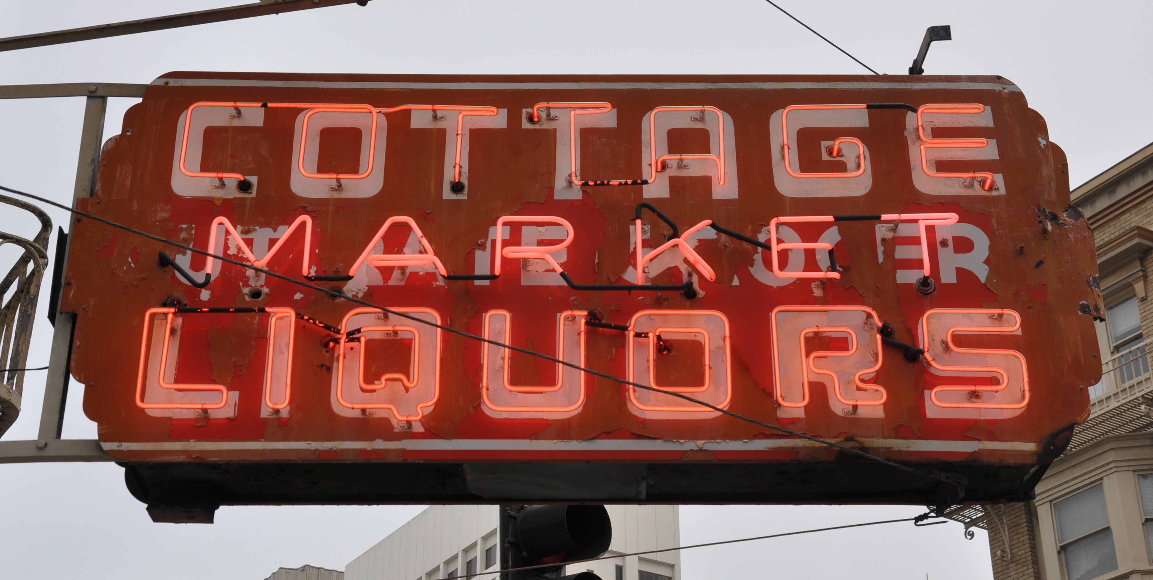 At least the grey skies didn’t interfere with a little nighttime shooting. This sign in San Francisco has been painted a dull bricky orange. There are red porcelain enamel panels underneath — and mysterious text behind “Market”: