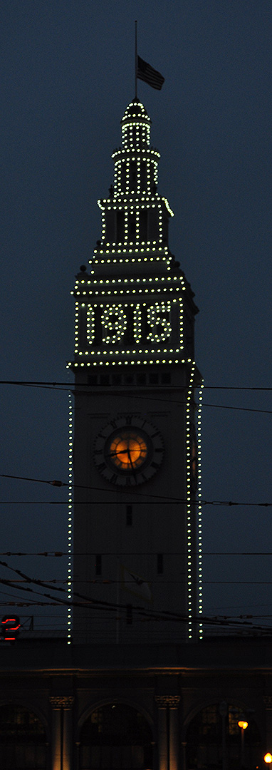 In March, bulbs were added to the Ferry Building at the foot of Market Street in San Francisco to commemorate the centennial of the Panama-Pacific International Exposition. This is how the building would have appeared at night then. The bulbs will be removed in December: