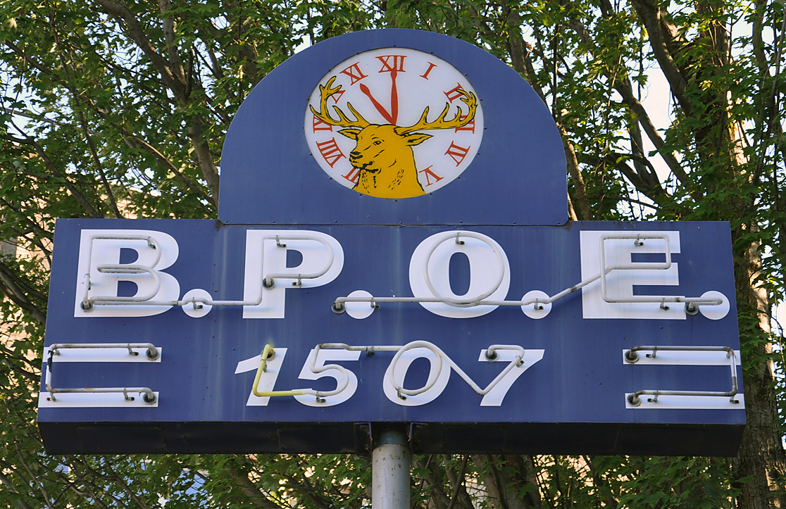 This Elks Lodge sign is in Hood River. The top piece with the 11 o’clock toast & elk is backlit plastic and appears to be original to the sign. Probably from the 1960s: