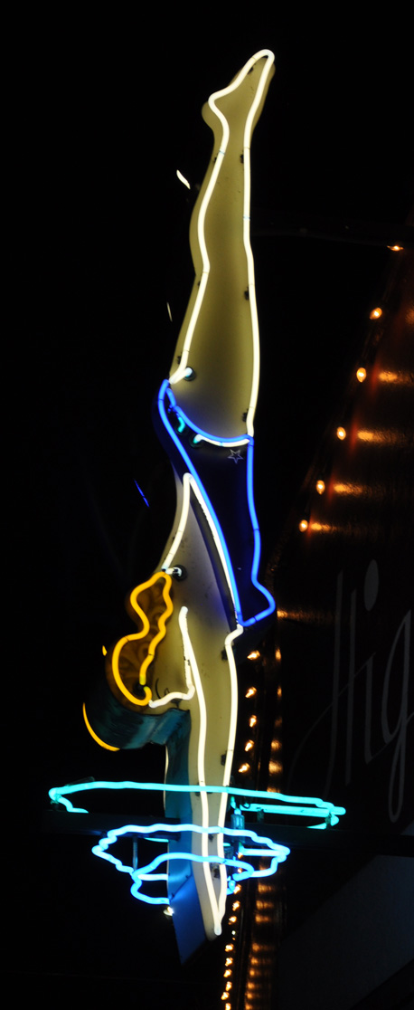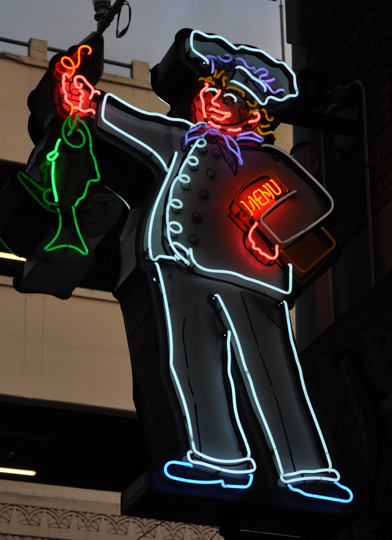 This sign at the Dahlia Lounge is modern. The fish’s tail moves in three-part animation: