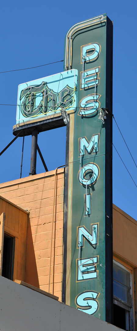 The Des Moines Cinema (in Des Moines) has been closed for at least a few years. Evidently, it was sold earlier this year and work was going on when I was taking this photo. I don’t know if this will reopen as a theatre or something else. They’d better not touch this sign!