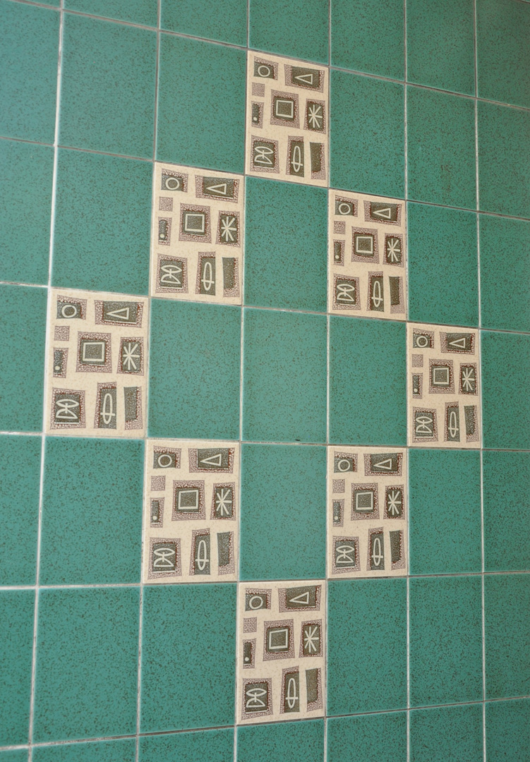 The exterior features vitrolite and these cool mid-century modern looking tiles: