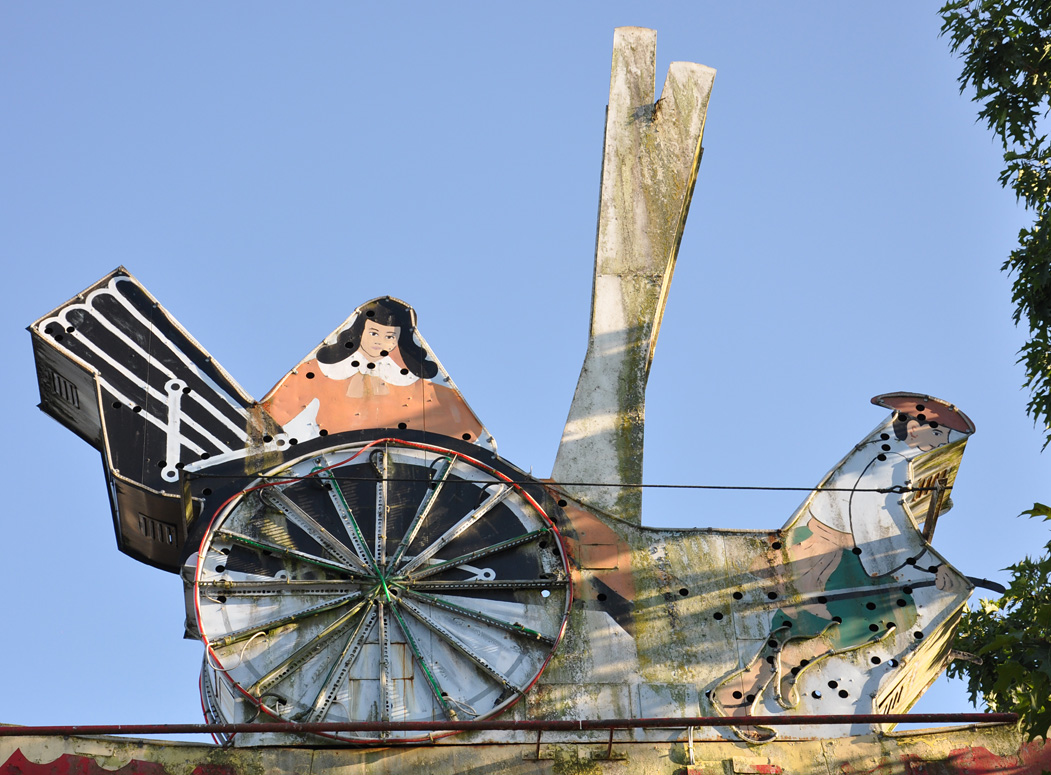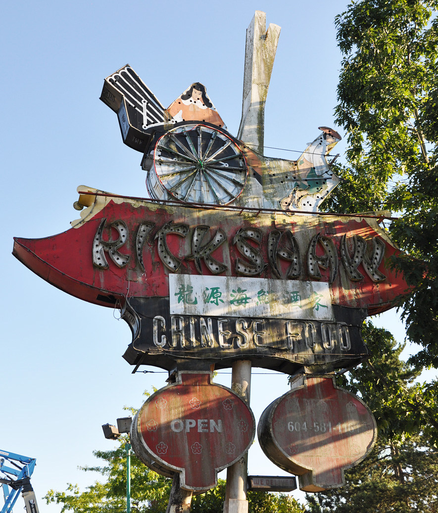 After a lengthy and thorough search of my van by border personnel, some interrogation and overly personal questions, trauma to the dogs (being locked in a crate in 100 degree temps), we arrived in Canada — a little later than planned. The light was already waning — so, here’s the best I could do for the incredible Rickshaw sign in Surrey: