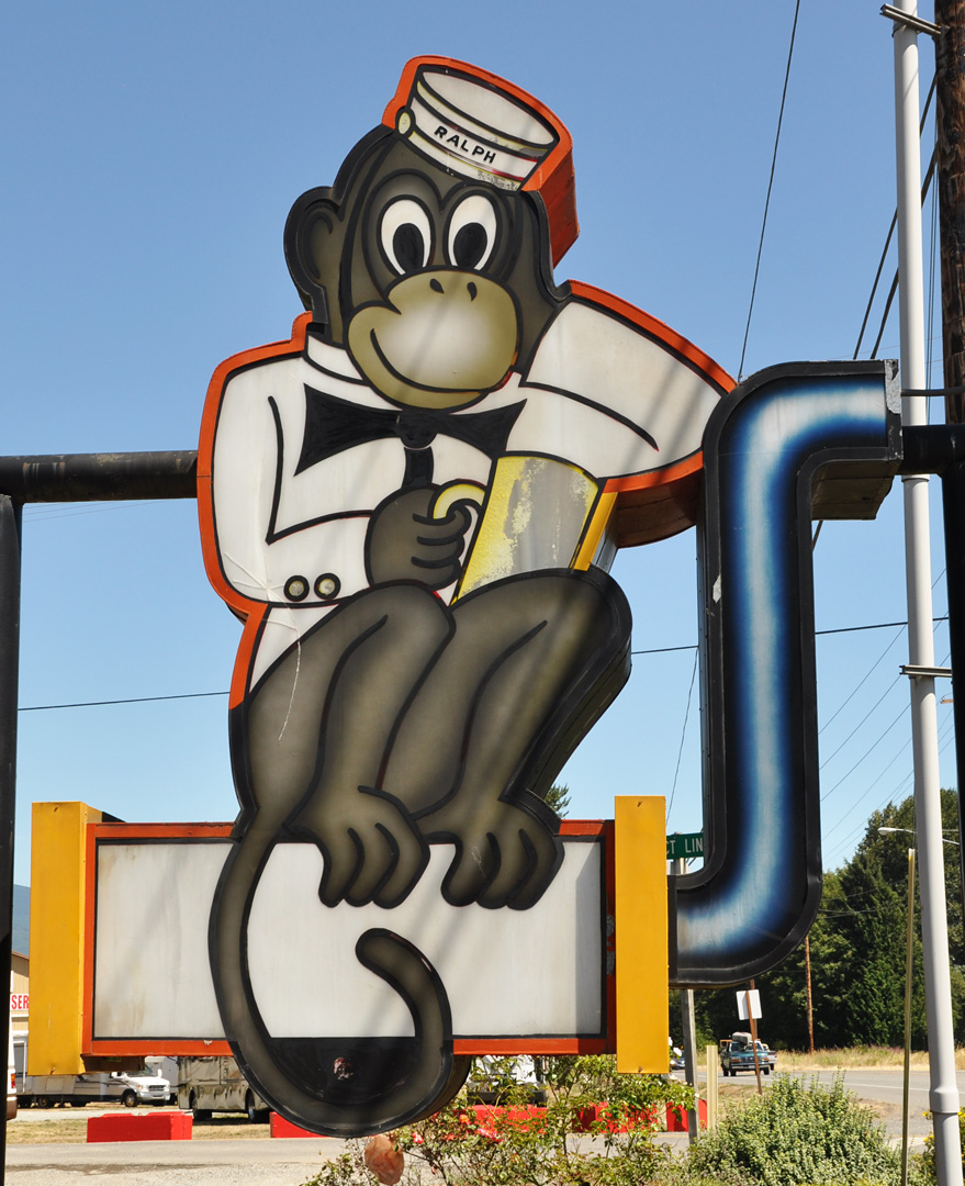 This sign is at Mom’s Cafe in Burlington. Mom’s is closed now — let’s pray this backlit plastic monkey is adopted by the next tenant: