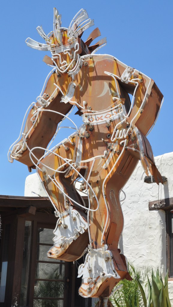 I finally found out where the Hoop Dancer sign in Tucson was located & got some photos of him. The panels are ripple tin and in great shape. Heather David’s got a nice vintage postcard for context: https://www.flickr.com/photos/14696209@N02/48924229068/