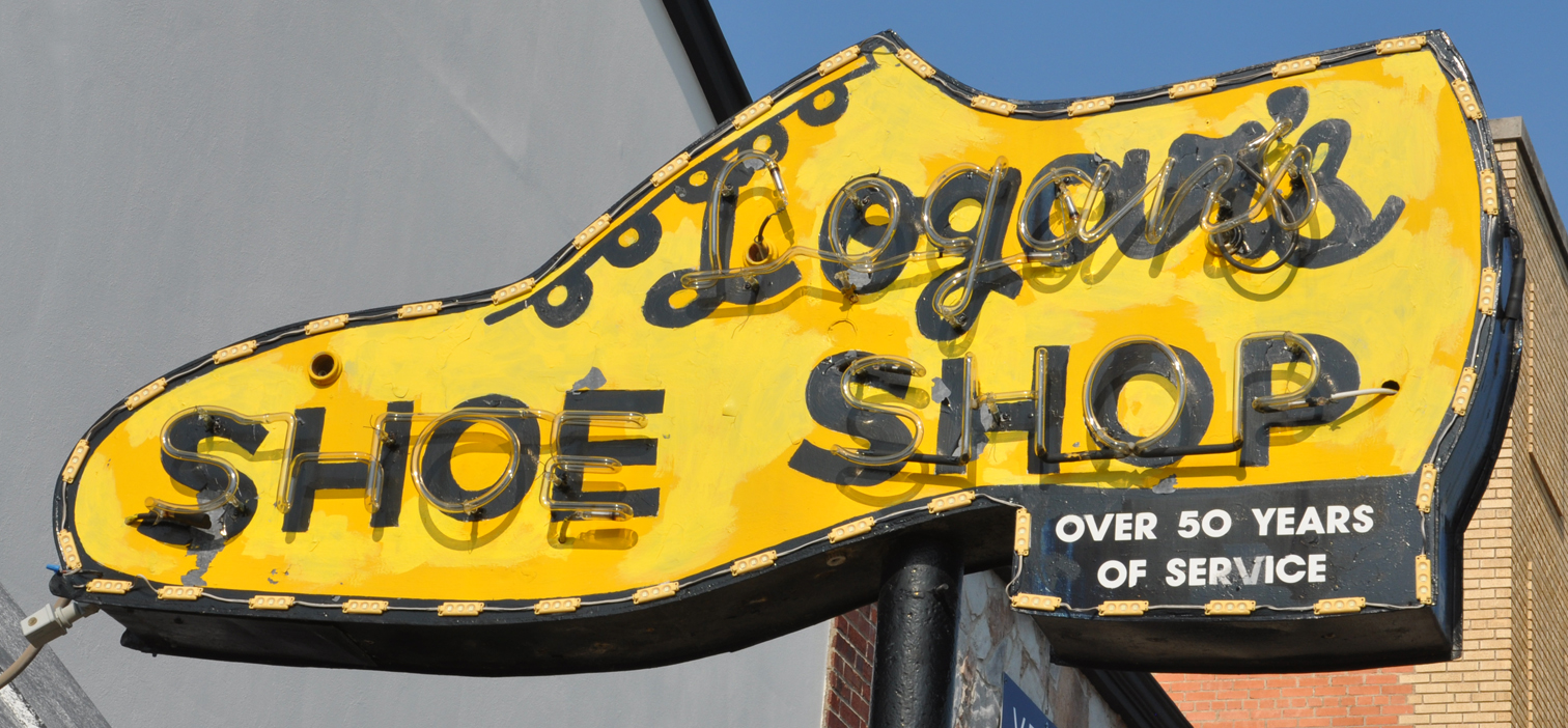 And from August — the neon outline is gone, replaced with little LED crap around the edge of the sign. The nice, human-painted script replaced with dull block letters. And the paint — well, either paint the whole damned shoe or leave it alone if you can’t match the color!