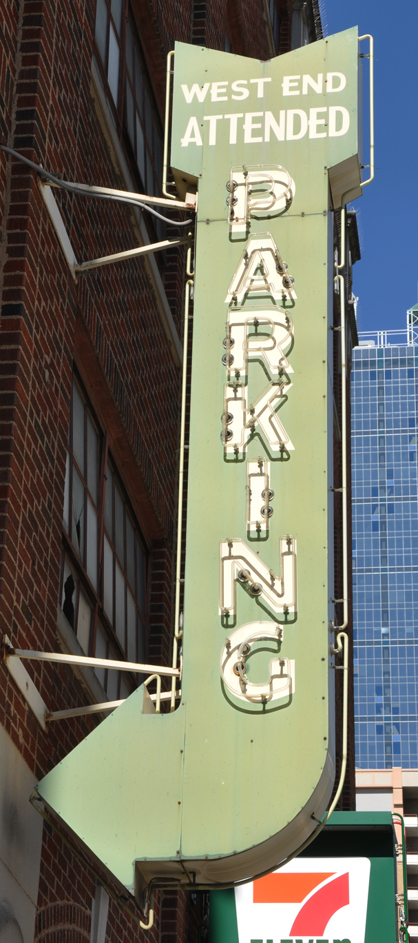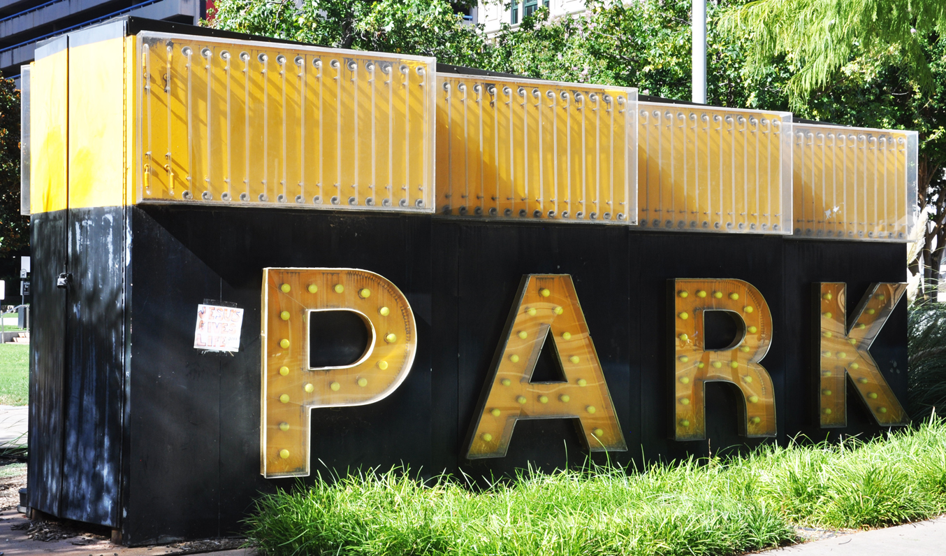 This was originally a parking sign. When the parking garage was demolished, this chunk of the sign was saved and installed in the new park that replaced it.