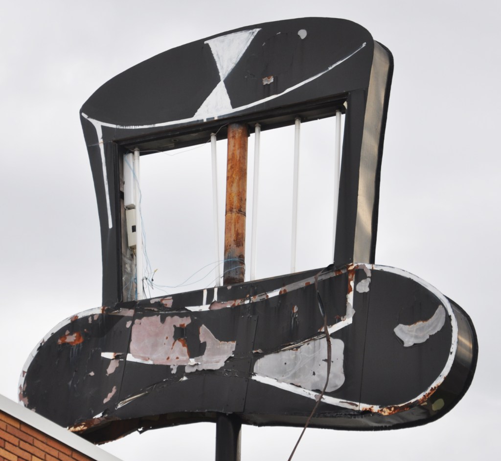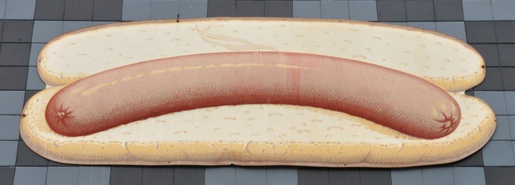These two are on the facade of Charlie Joseph’s restaurant in LaGrange, GA. I love the detail and steam coming off of the meat on each of these. These single-sided plastic signs were mass-produced but I have only seen a couple of others still on display: