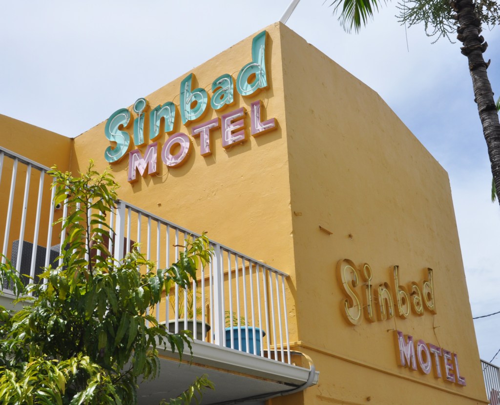 The Sinbad Motel was built in 1953. That chopped off metal projection on the roof originally had a seagull. The gull was destroyed in a hurricane and then a sputnik style Neo Lectra was installed after that. That was also destroyed by another hurricane but the steel arm remains.