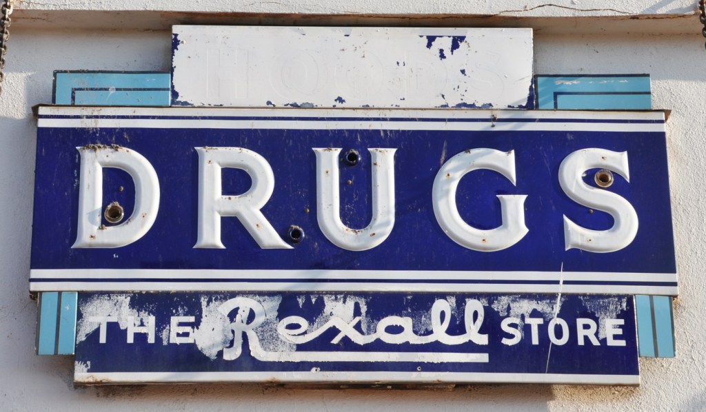 This drug store in Crescent, OK goes by another name now but the Hood’s Drugs panels were saved and installed on the side of the building: