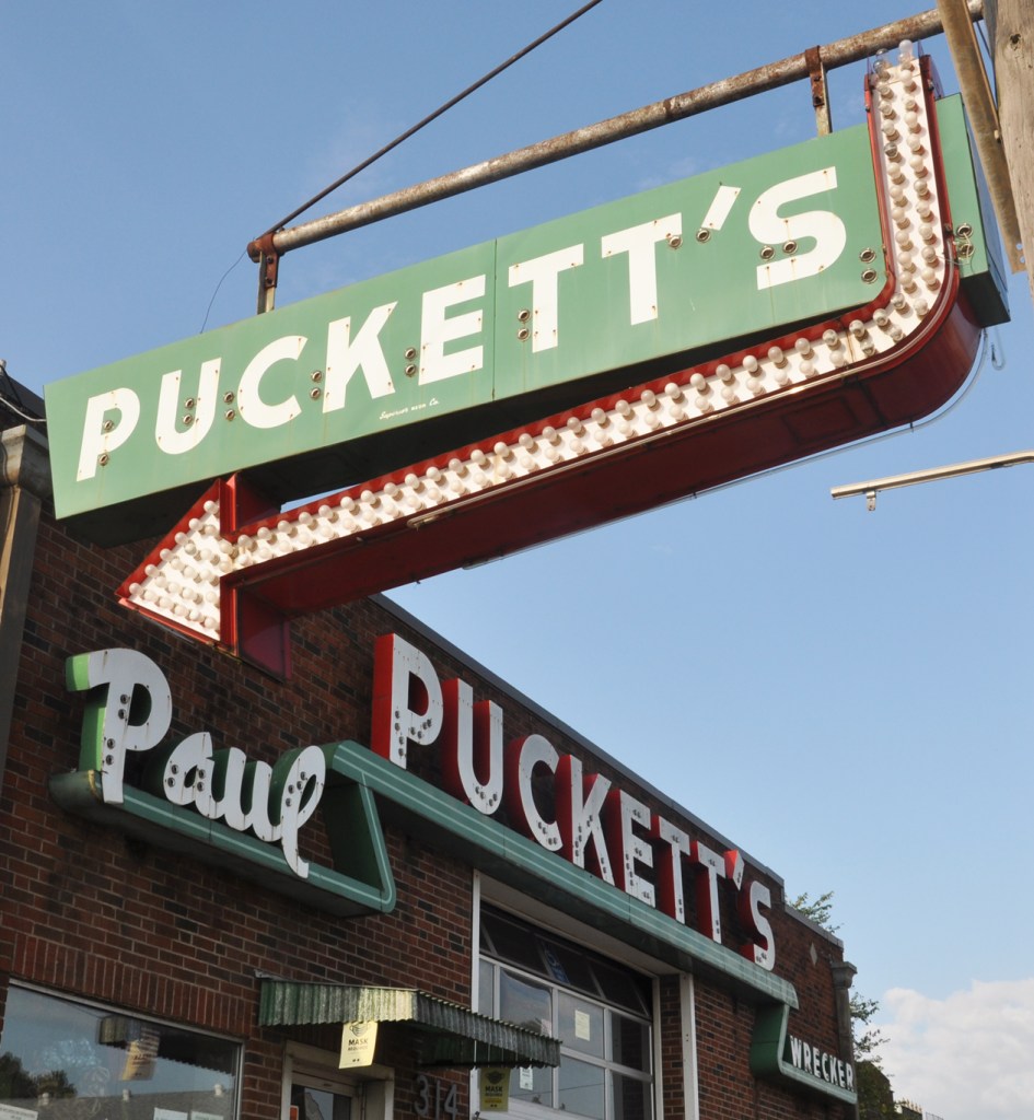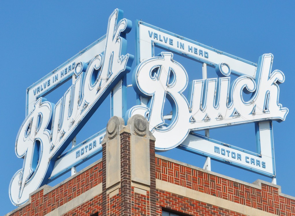 A modern replica sign from 2014 installed on a former Buick dealership building on Automobile Alley: