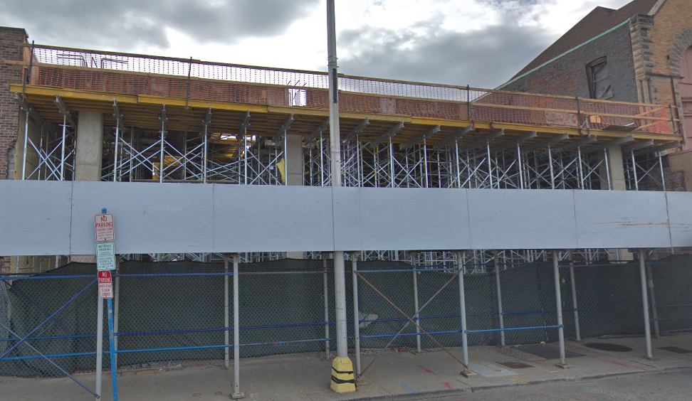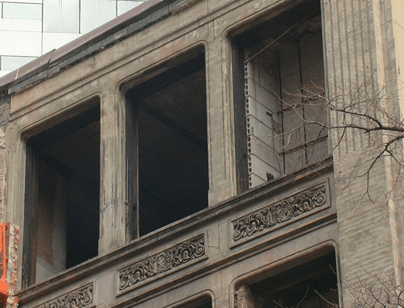 Evidently, the building is actually two buildings underneath. After a fire around 1950, this modern brick slipcover was put around them and the top two floors were removed. Google doesn’t have the latest look yet but in January, removal of the facade began, revealing the 1890s details. Here’s a video describing the history of the building and what they are doing: