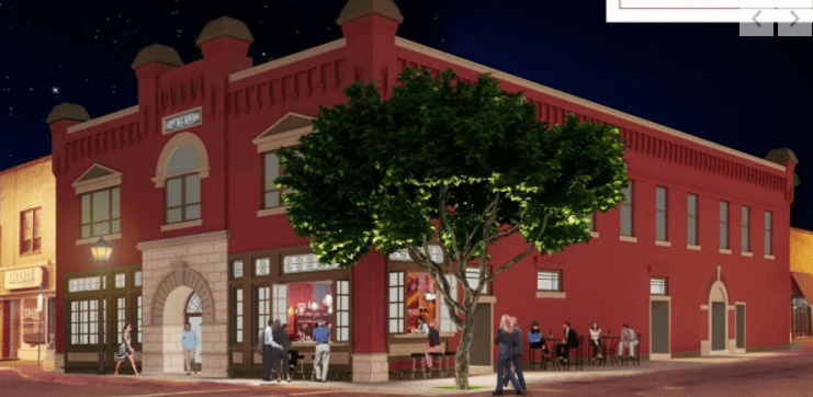 From the Post-Register, here’s an illustration of the planned finished product — note the big-ass arch on the front that recreates the original. But they didn’t bother replicating the nicer arch further left. Nor did they take the time/trouble/$$ to recreate the round window above the center arch: