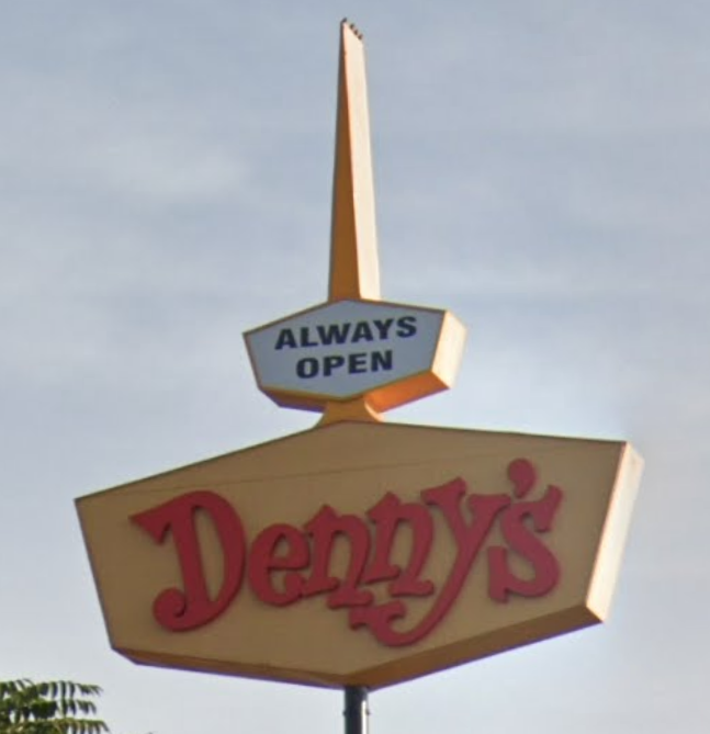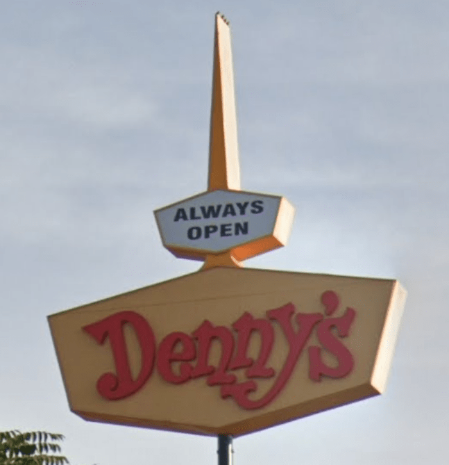 One of the very few remaining Denny’s neon signs was updated with backlit plastic around 2019. Here’s the sign in Stockton, CA in 2014: