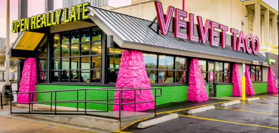 It has now been adapted for a Velvet Taco and opened in January. Google Maps doesn’t have a photo yet but here’s one from company’s FB page. The original roof has been uncovered and the rocky columns preserved (although pink is a little harsh). There must have been hundreds of these buildings around the country beginning in 1968 but only about 19 survive, and none used by Roy Rogers anymore:
