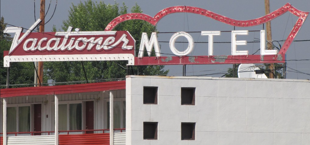 I was really looking forward to seeing this one. It looks like the bulbs & neon were in good shape. Maybe by some miracle, they are restoring it? However, it’s so big (what, 40 feet wide?) that I can’t imagine going to that trouble of taking it to a shop & returning it instead of restoring in place. So, the Vacationer Motel in Kalispell, MT got a new coat of beige paint and this guy is apparently gone. Here’s a photo from my pal, Seth: