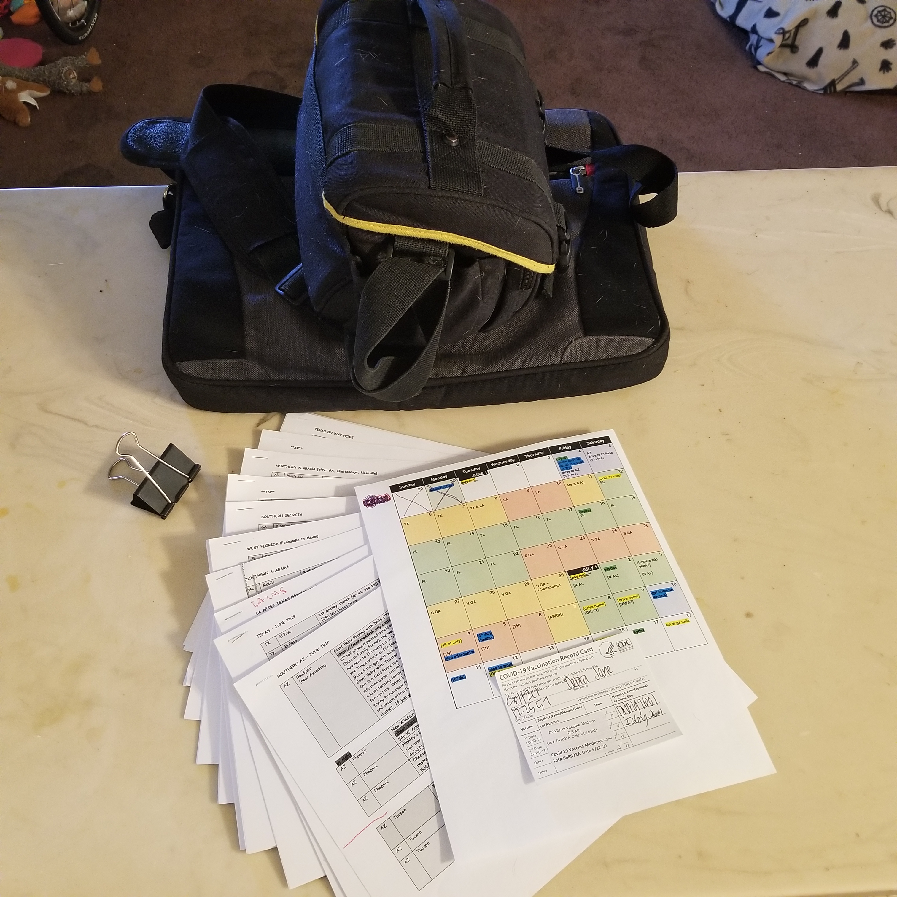 The camera, the laptop, the schedule, the lists, and my COVID card: