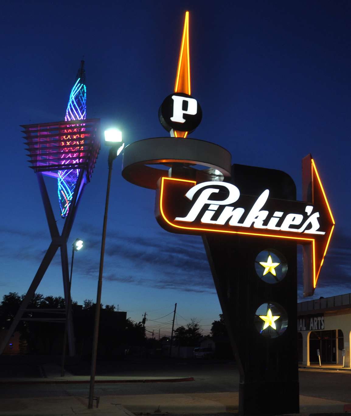 At the Rock Hill Shopping Center in Odessa, TX, this is the Pinkie’s Liquor sign and the long abandoned Cloth World sign in the background which was given an LED sculptural feature in 2019: