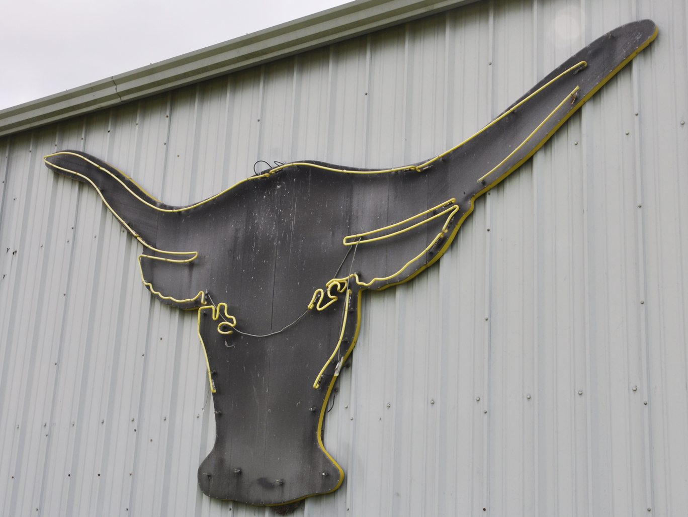 The Longhorn Travel Plaza in Vinton, LA has a broken neon sign on the side of a storage building: