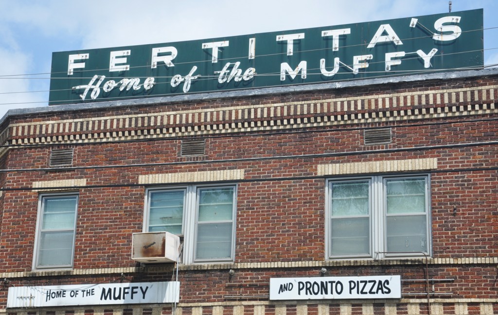This later sign was installed when the place became a sandwich shop, featuring muffaletta sandwiches: