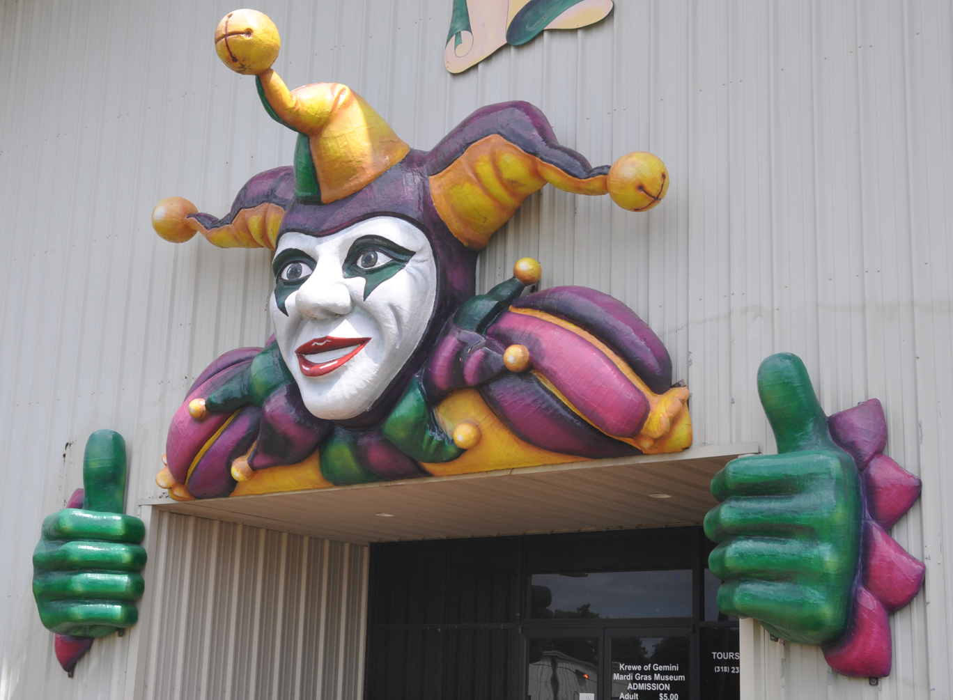 This giant jester is located in Bossier City, LA at the entrance to the Krewe of Gemini Mardi Gras Museum: