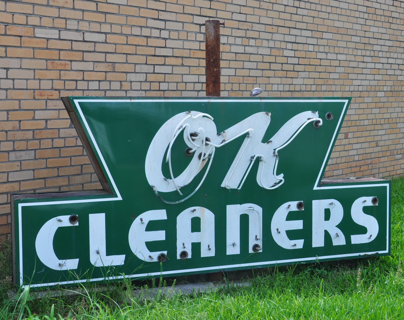 OK Cleaners in Shreveport has been closed for years. This former pole sign has been leaning against the building since at least 2008: