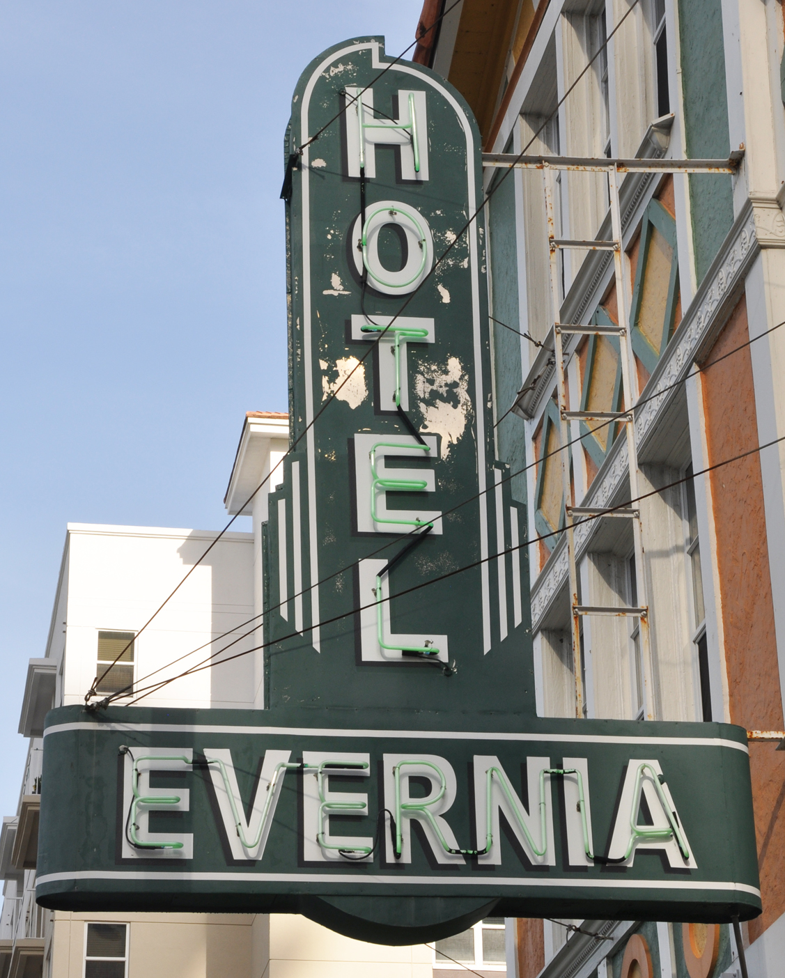 The Hotel Evernia in West Palm Beach opened in 1925 as the Hotel Enoree. This sign looks more 1930s/1940s. The hotel became the Evernia in 1979 and this sign was adapted then.