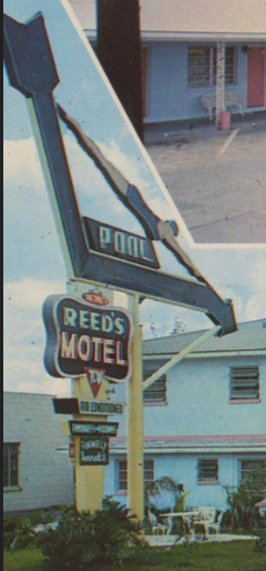 Reed’s Motel in Avon Park opened in 1957 as Bennett’s Motel. The original pole sign was adapted later for Reed’s Motel and the diving woman was added then of after that. She originally wore a one-piece bathing suit: